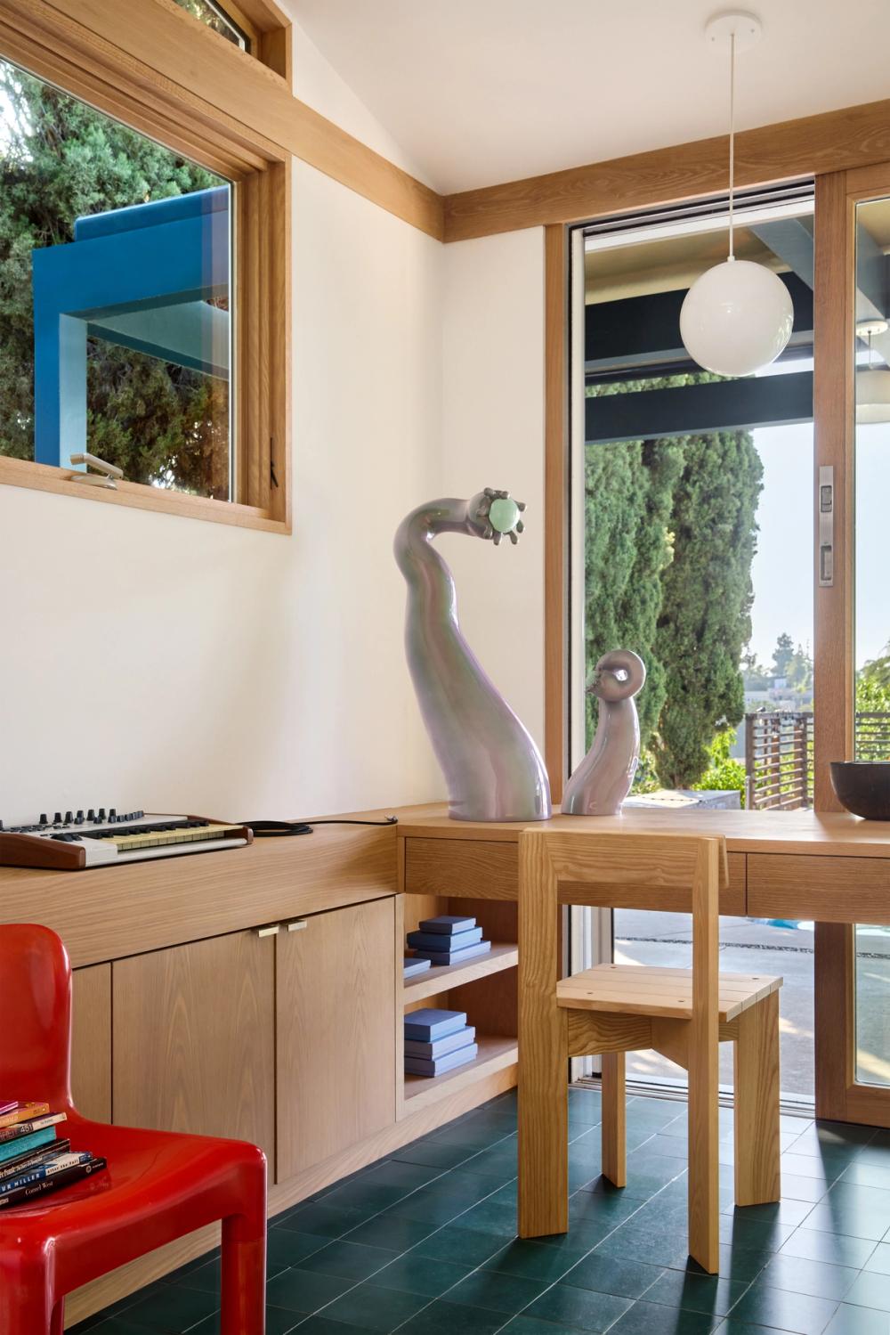 A small home office, also overlooking the pool and patio, is just beyond the kitchen, with the same Villa Lagoon concrete tile flooring. The custom desk is paired with a vintage, red Kartell chair and a Ferm Living Ark dining chair.