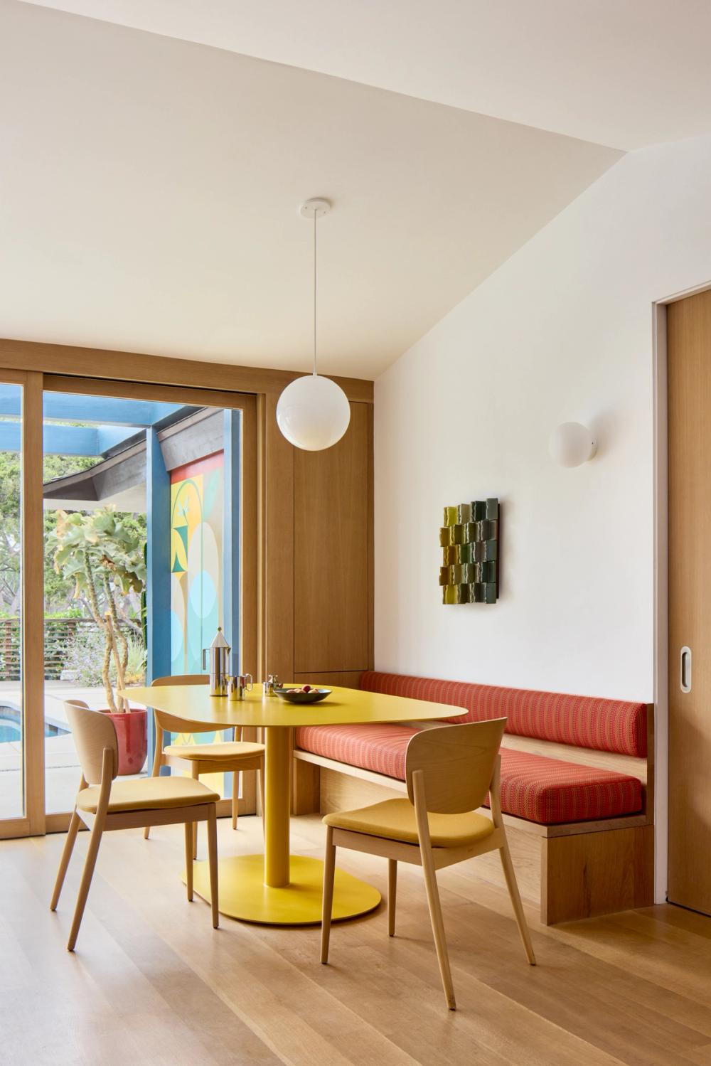 The new breakfast nook pairs a custom bench and table, both manufactured by Maneuverworks and surrounded by DWR Valencia chairs. A Flos wall sconce and a Schoolhouse Electric Luna pendant light illuminate the space.